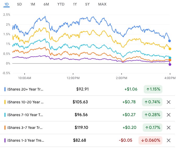 The old rule still holds: when stocks fall, bonds rise. Investors fleeing equities are piling into bonds, pushing up prices and lowering yields. The longer the duration, the more sensitive they are—and the bigger the price surge.