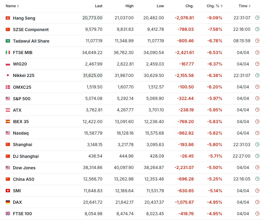 Major indices in Europe—STOXX, DAX, FTSE 100—fell around 5%. Hong Kong reopened from a holiday and promptly tanked 10% on Monday morning. Japan’s Nikkei 225 was down 6%. Even Singapore’s STI, once seen as a safe haven, dropped 3% on Friday and another 6% on Monday.